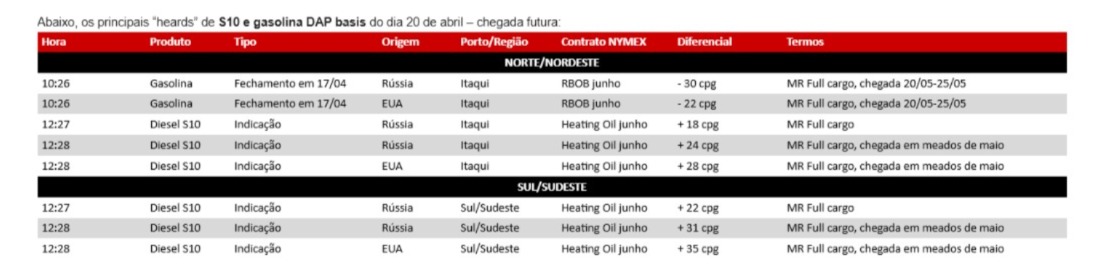 informações fornecidas pela agência Platts, parte da S&P Global Commodity Insights, com notícias relevantes sobre o setor.Agência Platts – 20 de abril de 2026